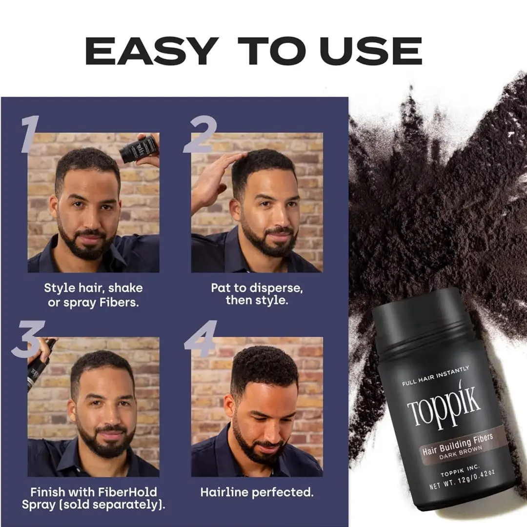 Toppik Hair Building Fibers are made of natural, colored Keratin Fibers - the same protein that makes up human hair. The Keratin protein is derived from a natural source, and is nearly identical to human hair.